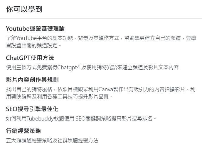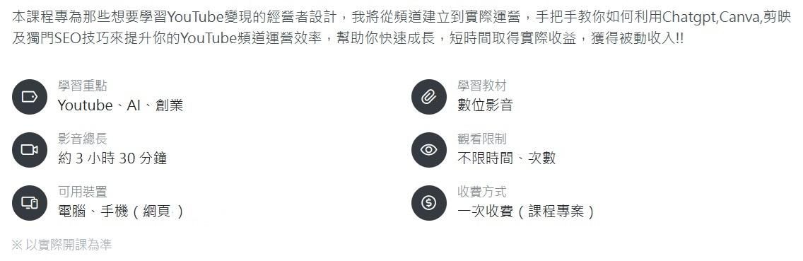 本課程專為那些想要學習YouTube變現的經營者設計,我將從頻道建立到實際運營,手把手教你如何利用Chatgpt,Cavna剪映及SEO技巧來提升你的YouTube頻道運營效率,幫助你快速成長,短時間通過營利或取被動收入!![💰購買完成即可觀看唷 💰]